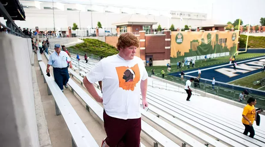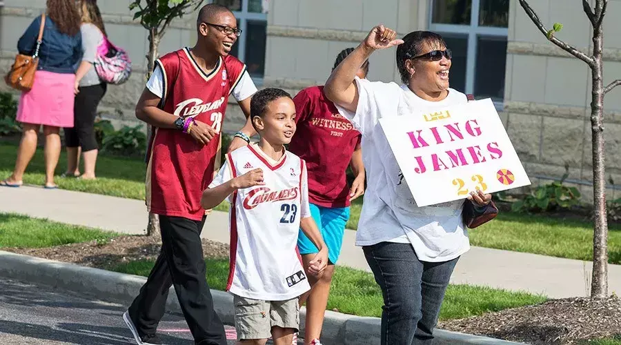 所有受邀的媒体,我打冷眼一看,得有不下100人。这么多人先被运到克里夫兰休整。在那之前,我从来没去过克里夫兰。那还是詹姆斯在骑士的1.0时代,还没第一次打进总决赛,所以没什么机会去,也从来没有人说过,那地方有趣。然后我们坐上一辆辆大巴,驱车40分钟,开往旁边一座叫阿克伦的小城,那是詹姆斯的故乡。