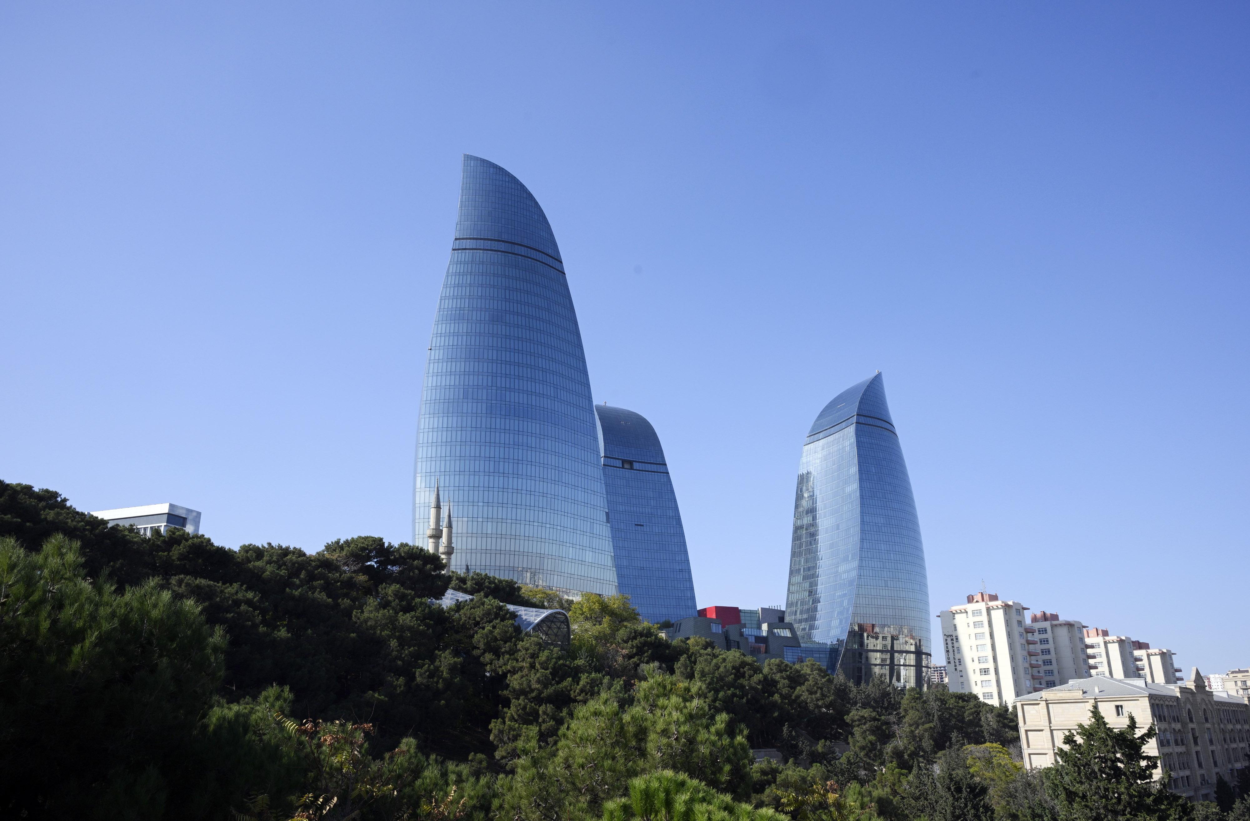 这是11月1日拍摄的阿塞拜疆巴库地标建筑之一——“火焰塔”。 新华社发(托菲克·巴巴耶夫摄)