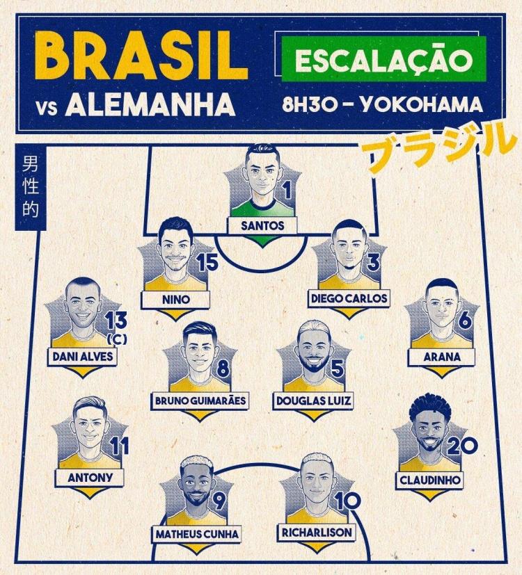 巴西国奥首发:1-桑托斯、3-迭戈-卡洛斯、6-阿拉纳、13-阿尔维斯、15-尼诺、5-道格拉斯-路易斯、8-吉马良斯、20-克劳迪尼奥、9-库尼亚、10-理查利森、11-安东尼