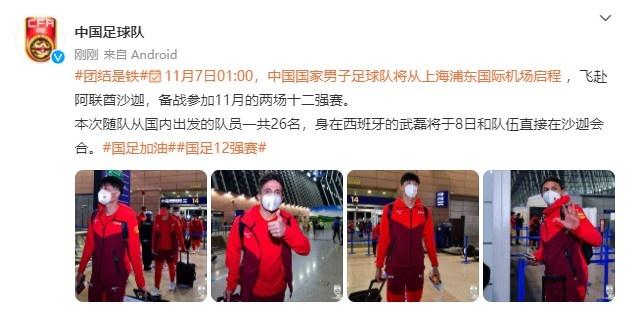 11月7日凌晨1:00,中国国家男子足球队将从上海浦东国际机场启程 ,飞赴阿联酋沙迦,备战参加11月的两场十二强赛。