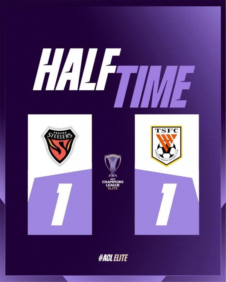 上半场比赛结束,山东泰山1-1浦项制铁。