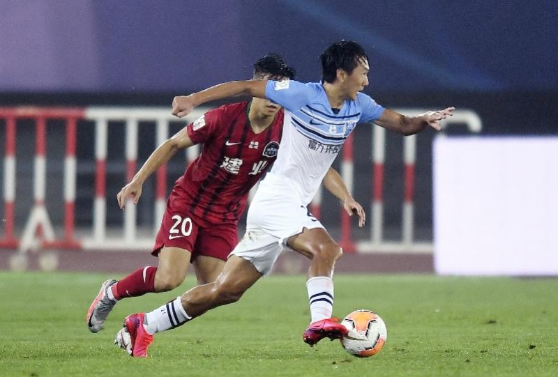 9月13日,叶楚贵(左)在江苏苏宁的中超比赛中拼抢。 新华社发