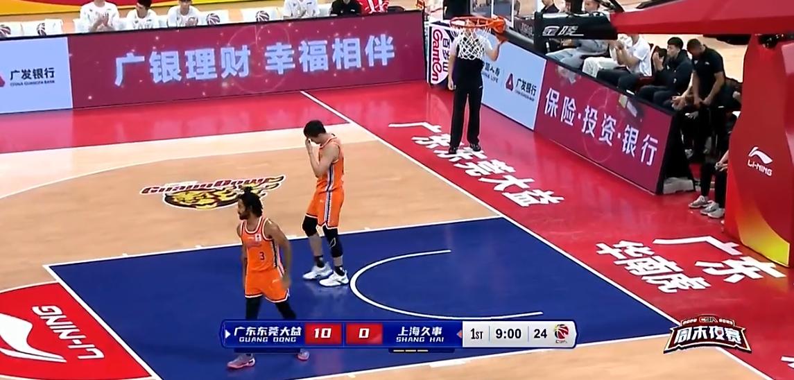 比赛前三分钟,上海队迟迟无法得分,广东队打出10-0攻击波,直接打得上海被迫喊停。