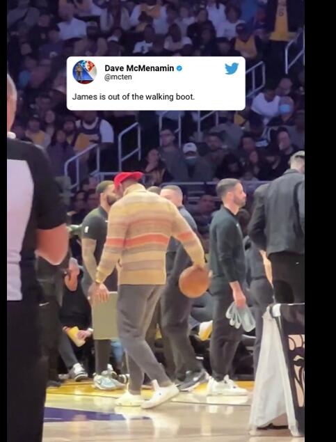 勒布朗-詹姆斯今天回到了现场观看比赛,并且脱掉了保护靴在场边运球。