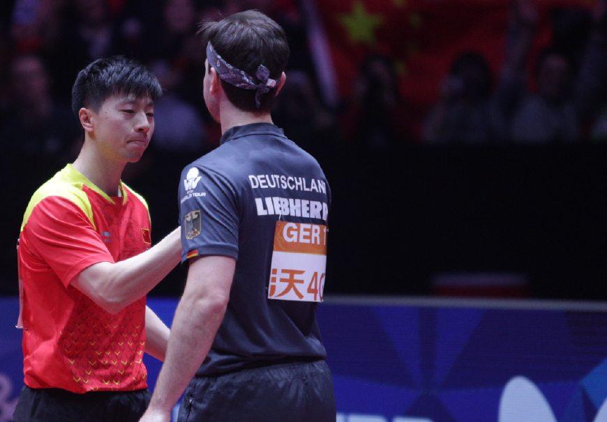波尔逆旋转发球,马龙正手抢冲斜线,波尔反手快撕,马龙再拉出界,11-10。