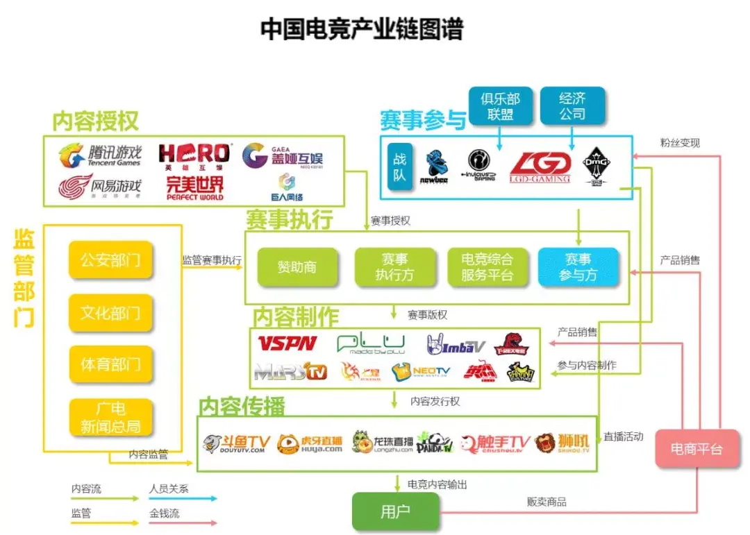 在现代社会,竞技体育,往往会带来庞大的体育产业,如足球、篮球等,电子竞技的产业链则更长,上有游戏开发,形成用户基础,推进电竞赛事,中有电竞赛事联盟,组织举办赛事,进一步加热电竞行业,下有直播、陪玩、解说等各种社交媒体进行内容传播,实现创收。