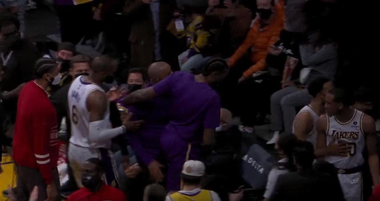 而在半场哨响之后,詹姆斯原本是在后场开球,刚好时间不够,球开出后哨向,进入中场休息,此时球场另一边的湖人球员和工作人员已经开始走向更衣室通道,只见詹姆斯突然从后场加速,跨过整个球场直接冲向更衣室通道入口位置,并且一直喊着湖人助教菲尔汉迪。
