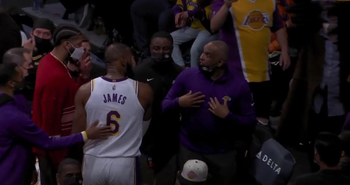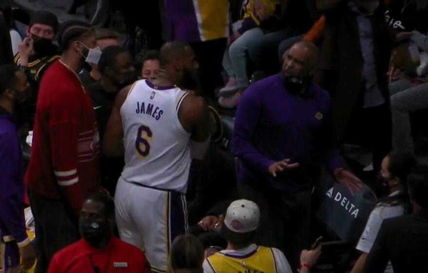 本场比赛中场休息时候出现让球迷热议的一幕,球队准备回到更衣室休息,这时候詹姆斯追上球队的助教汉迪发生激烈言语上争执,可以看出汉迪摘下了口罩非常的激动,根据球员通道的球迷拍摄的视频看,詹姆斯与汉迪是一路争吵的回到更衣室。