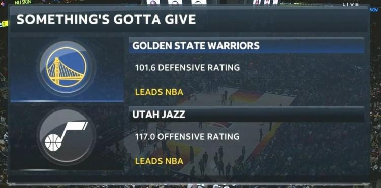 在赛前,转播方给出了一个观赛小提示,指出勇士队目前的防守效率(百回合失分)为101.6领跑全联盟,而爵士队则以117.0的进攻效率(百回合得分)高居联盟榜首。