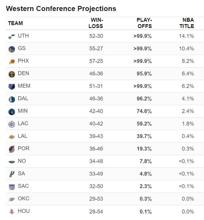 西部方面,爵士、勇士、太阳和灰熊晋级季后赛概率都已经超过99.9%,夺冠概率爵士14.1%,勇士10.4%,太阳8.2%,灰熊6.2%。湖人季后赛概率39.7%,夺冠概率0.4%。