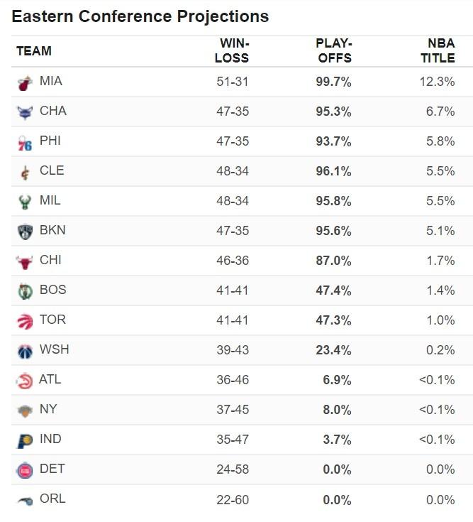 直播吧1月23日讯 今天,ESPN根据BPI指数,对各队本赛季的前景进行了预测。