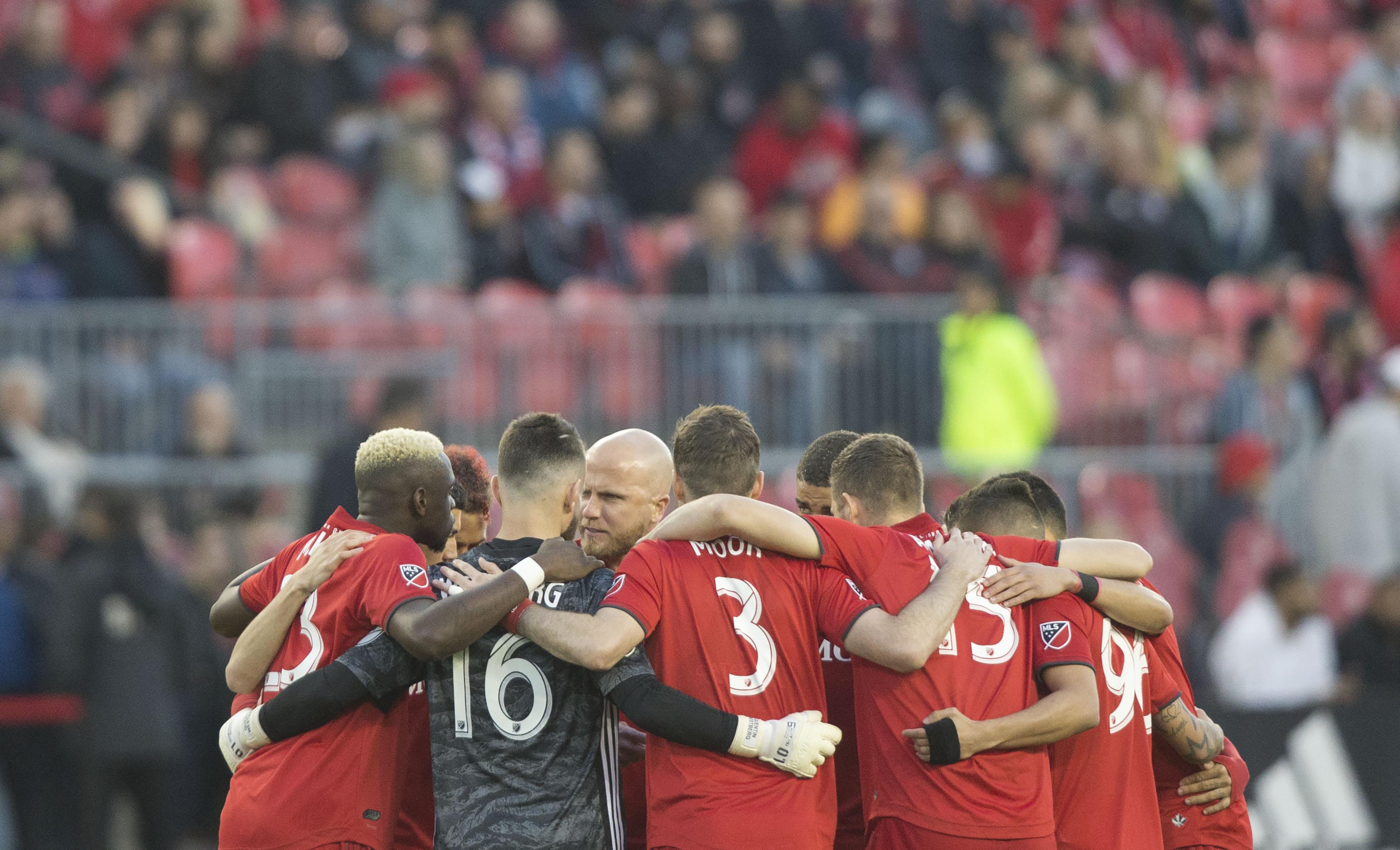 新华社照片,多伦多,2019年5月16日 (体育)(3)足球——美国大联盟:华盛顿联平多伦多 5月15日,多伦多队在比赛前。 当日,在2019年美国足球大联盟比赛中,华盛顿联队客场以0比0战平多伦多队。 新华社发(邹峥摄)