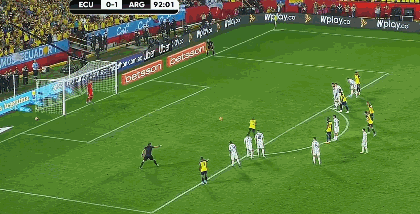 比赛第89分钟,厄瓜多尔的外围射门,阿根廷防守球员有手球嫌疑,裁判通过VAR回放,判定点球,瓦伦西亚的点球,第一下没进,补射打进,厄瓜多尔1-1扳平。