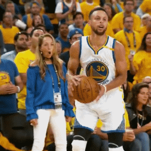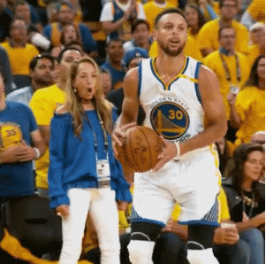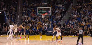 继续看,这简直就是极限的“拜佛”,拜佛是一种假动作技巧,难度很高,而库里这种则堪称是极限拜佛,完全没毛病这球