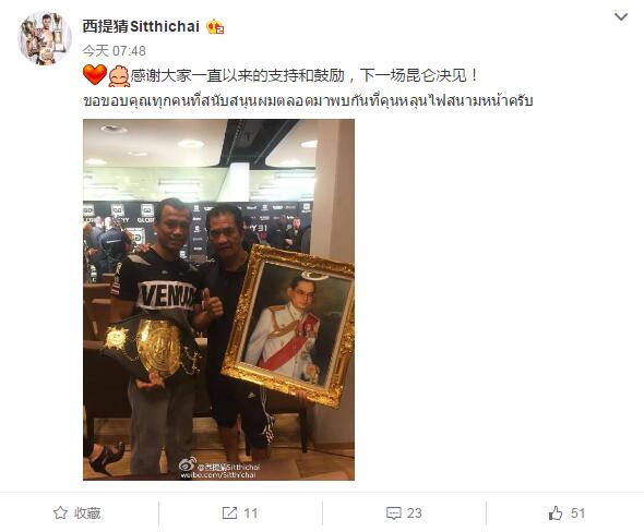 西提猜是新生代的泰拳王,曾荣获2015年鸿坤昆仑决70公斤级世界冠军诸神之战的总冠军。2016年,西提猜继续参与昆仑决诸神之战的争霸,所以这次打完Glory赛事,他就迫不及待的备战昆仑决诸神之战,下一场他在昆仑决的比赛将是2016诸神之战的16进8的淘汰赛。