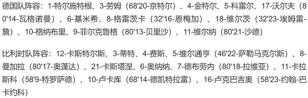 德国首发:1-特尔施特根,17-沃尔夫(79’14-瓦格诺曼),4-金特尔,5-科雷尔,3-劳姆(67’20-冈特),8-格雷茨卡(32’16-恩梅查),6-基米希,10-格纳布里,11-维尔纳(80’21-沙德),18-维尔茨(31’23-埃姆雷-詹),9-菲尔克鲁格(80’13-贝里沙)