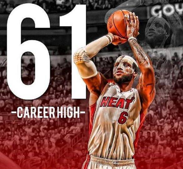 詹姆斯公认的巅峰期无疑是热火时期了,在13-14赛季,詹姆斯场均砍下27.1分,并且还能送出6.3次助攻。在一场与夏洛特山猫的比赛中,詹姆斯砍下了职业生涯最高的61分,一举打消了人们对“詹姆斯不能砍高分”的质疑。但是,综合来看,科比的个人得分能力仍然凌驾于詹姆斯之上。