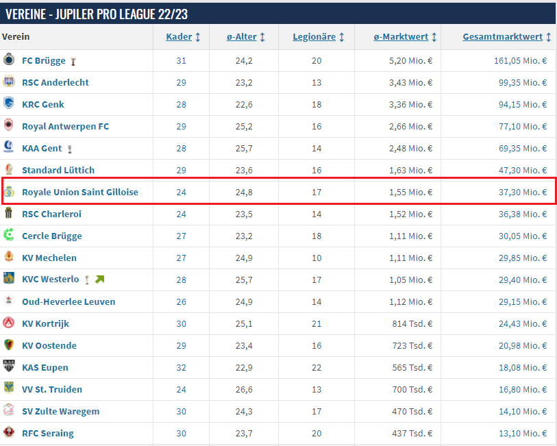 本赛季的比甲联赛共有18支队伍,总身价约为8.48亿欧元,比同样拥有18支球队的荷甲联赛和葡超联赛分别少了约1.8亿欧元和3.1亿欧元。其中身价最高的是本赛季在欧冠联赛提前晋级淘汰赛的布鲁日,其目前德转上的总身价约为1.6亿欧元,比甲中也仅有布鲁日的身价超过了1亿欧元。排名二、三位的分别是安德莱赫特(9935万欧元)和亨克(9390万欧元)。圣吉罗斯联以3730万欧元的身价仅位列联赛身价榜的第7位。
