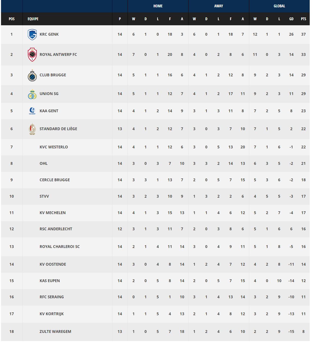 截至笔者发稿前,比甲联赛已经进行了14轮的争夺,目前亨克以4分优势领跑积分榜,安特卫普和布鲁日分列二三位,两者相差4分。圣吉罗斯联积29分位列联赛第4,距离排名第五的标准列日4分。比甲常规赛的前四名可以晋级争冠组的交叉赛,常规赛积分同时带入交叉赛。