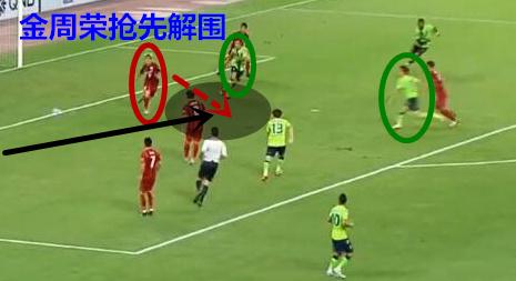 第16分钟,全北在前场形成持续的威胁,他们在左路成功传中,在中路有两名全北球员蓄势以待准备打门,但金周荣抢先一步将球解围,这样的防守专注力值得点赞。