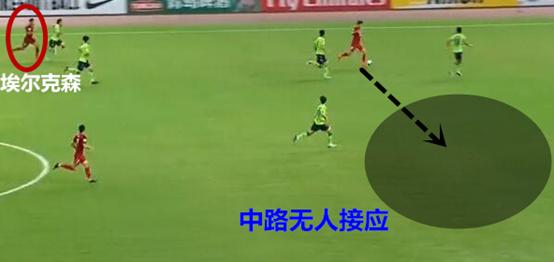 第24分钟,上港获得一次很好的反击机会,于海亲自抢下皮球与吕文君打出配合形成反击,不过此时在于海带球时,中路阴影区域没有人接应,一般来讲,这个位置是属于埃尔克森的,但此时埃尔克森在于海的后面,这就是埃里克森安排不当的结果,如果这个位置有“埃神”接应,他就有可能形成单刀局面。事实上在整个反击过程中,上港的左路人员太过充足,埃尔克森没有起到什么作用。