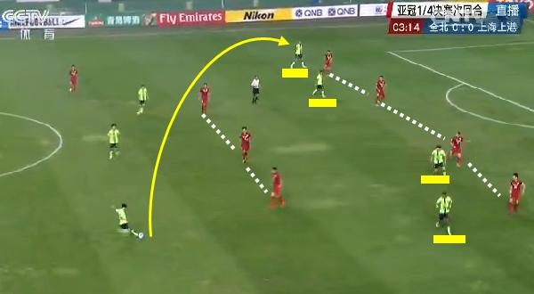 其实这样的问题在上半场已经出现了,当对手重点打击上海上港的边路防区的同时,伺机找寻上港三后腰背后的空间。