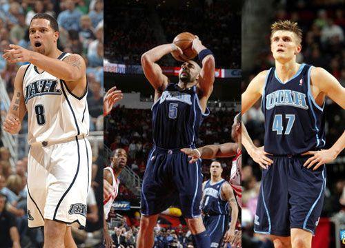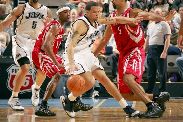 在进攻端奥库拉出来,利用移动优势和射程优势逼迫姚明到三分线防守自己,如果姚明出来,火箭禁区就成为真空,德隆-威廉姆斯和德里克-费舍尔可以肆意妄为突破,如果姚明坚守不出,奥库38.4%的三分球命中率不可能被视而不见 ,查克-海耶斯必然要出去防守奥库,布泽尔利用脚步优势对姚明进行突破以及中投,所以那时我们看到的比赛就是布泽尔屡屡单打姚明得手,火箭没有办法。加上海耶斯的身高难以对奥库进行很严重的干扰,奥库时不时在三分线外释放冷箭,让火箭苦不堪言。