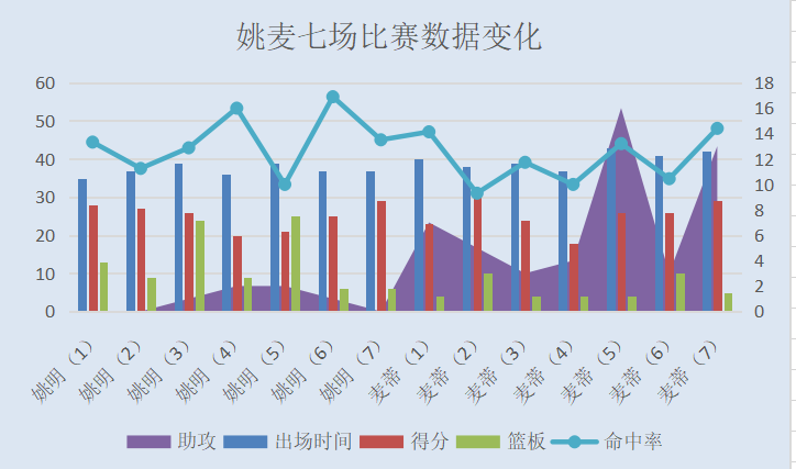 七场季后赛姚麦得分、命中率等数据变化