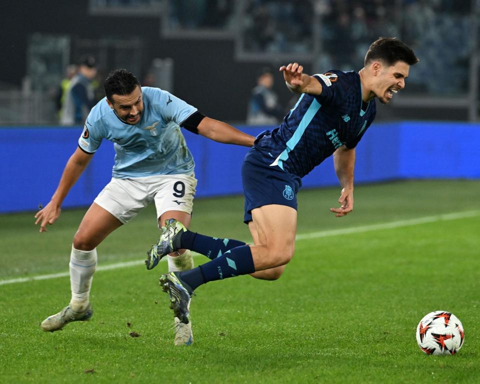 11月7日,拉齐奥队球员佩德罗(左)与波尔图队球员莫拉在比赛中拼抢。新华社发(阿尔贝托·林格利亚摄)