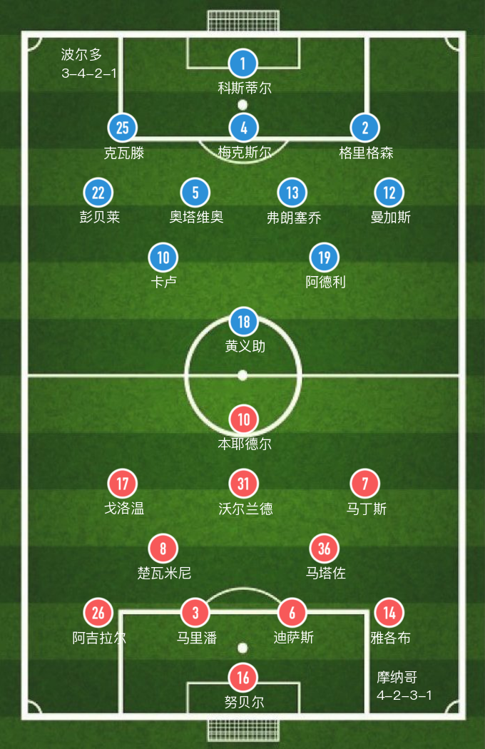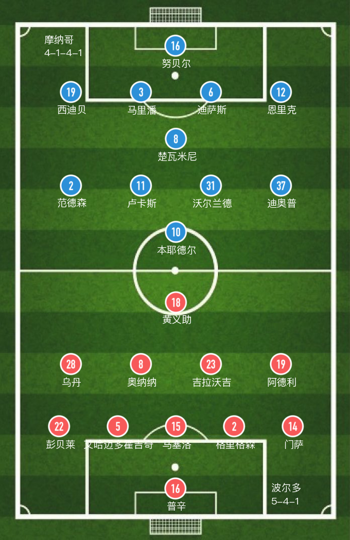 摩纳哥(4-2-3-1): 16-努贝尔,26-阿吉拉尔,3-马里潘,6-迪萨斯(74' 5-巴迪亚西勒),14-雅各布,8-楚瓦米尼(83' 22-弗法纳),36-马塔佐,17-戈洛温(57' 37-迪奥普),31-沃尔兰德,7-马丁斯(73' 27-迪塔),10-本耶德尔(74' 9-博阿杜)