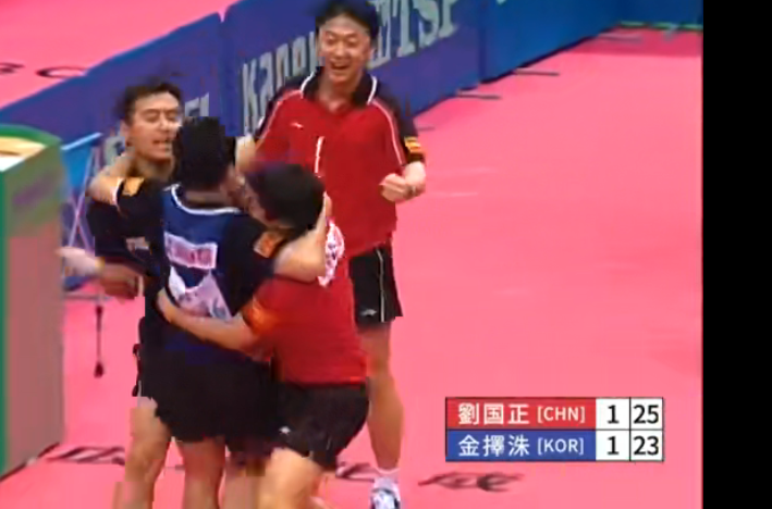 刘国正接发球连撇带挑到金泽洙反手,金泽洙推过来,刘国正反手迎前快撕,金泽洙侧身反拉,球下网!刘国正25-23获胜!