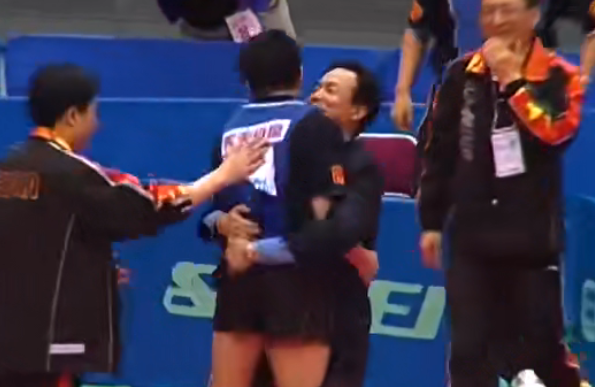 孔令辉跑向刘国正时,又回头先是抱住了刘国梁!两人互相拍了几下,激动得无法描述!马琳也跑了进来!两人几乎同时抱住了刘国正,刘国梁更是使劲地抱着刘国正,因为用力过猛,刘国正再次倒在地上!刘国梁、马琳、孔令辉情不自禁地抚摸着刘国正的脸!这一刻太激动了!太欢乐了!胜利来得太不容易了!尹宵教练和王励勤也进得场来!