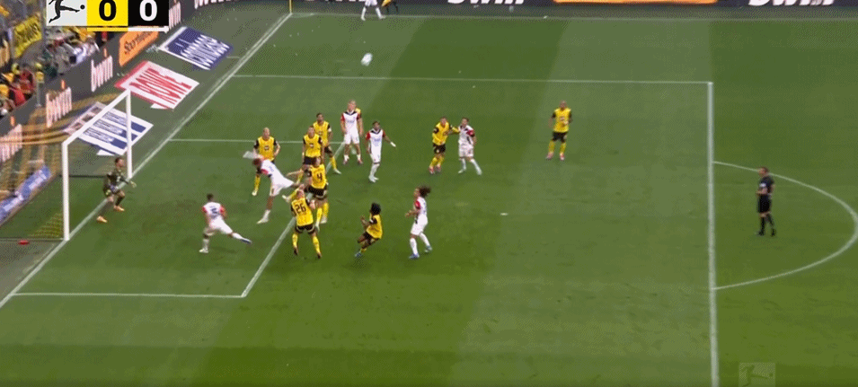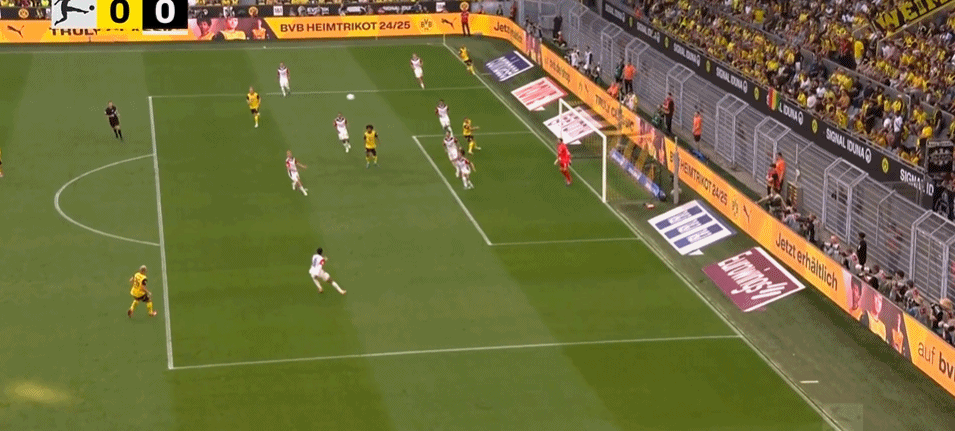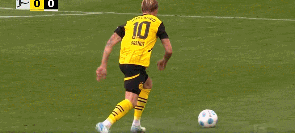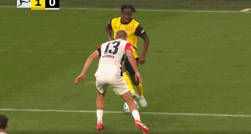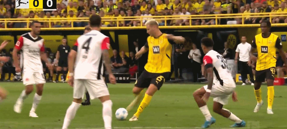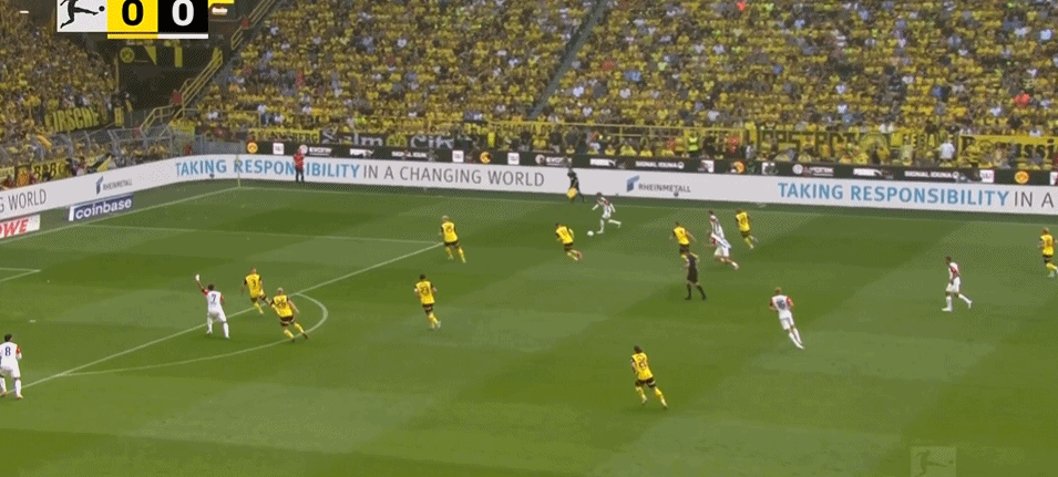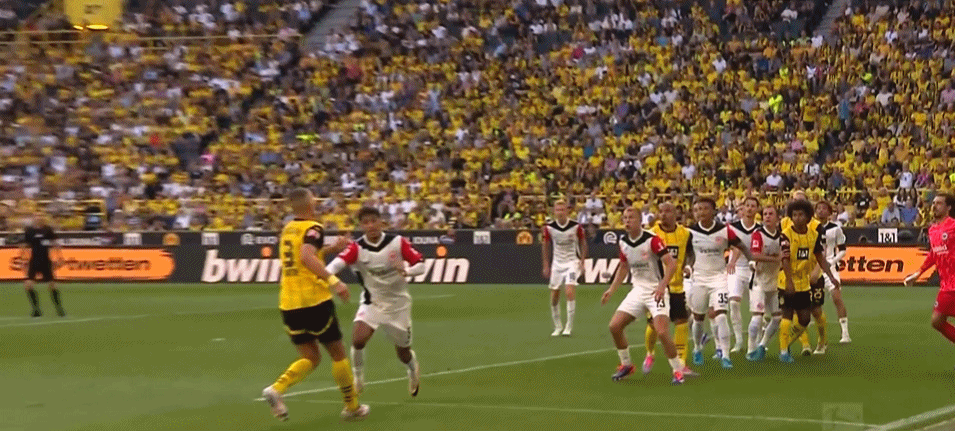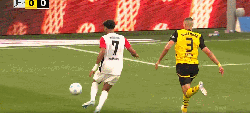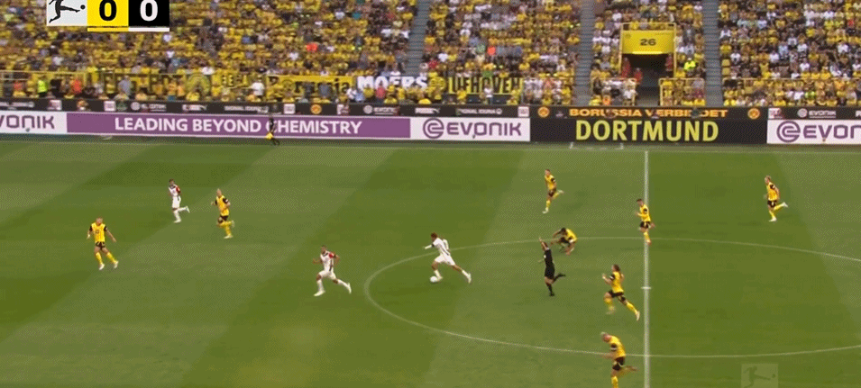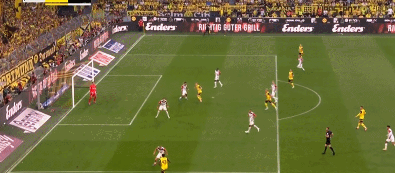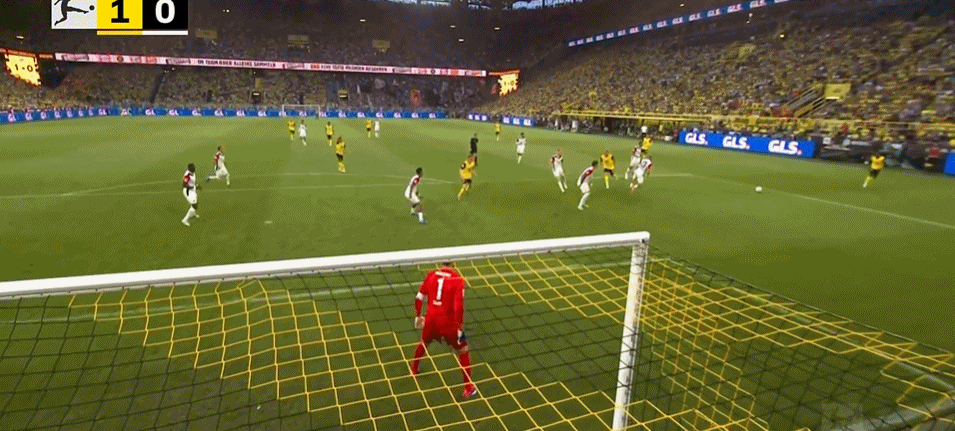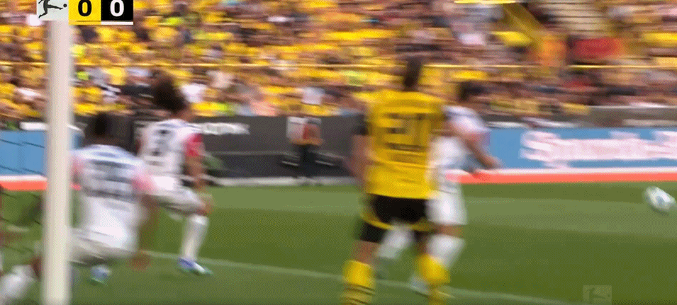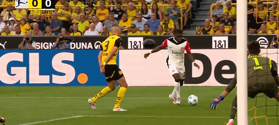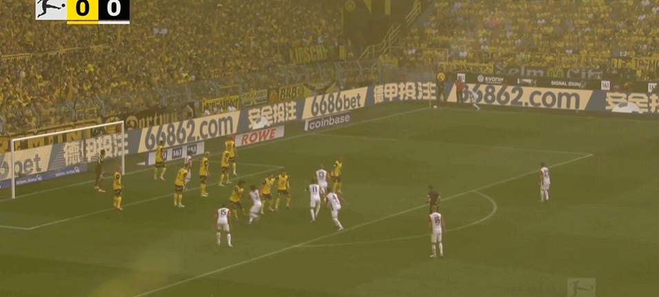 第72分钟,多特打破场上僵局,替补登场的吉腾斯左路面对防守,他踩单车晃开角度后小角度起脚爆射,皮球飞入球网,多特1-0领先法兰克福。↓