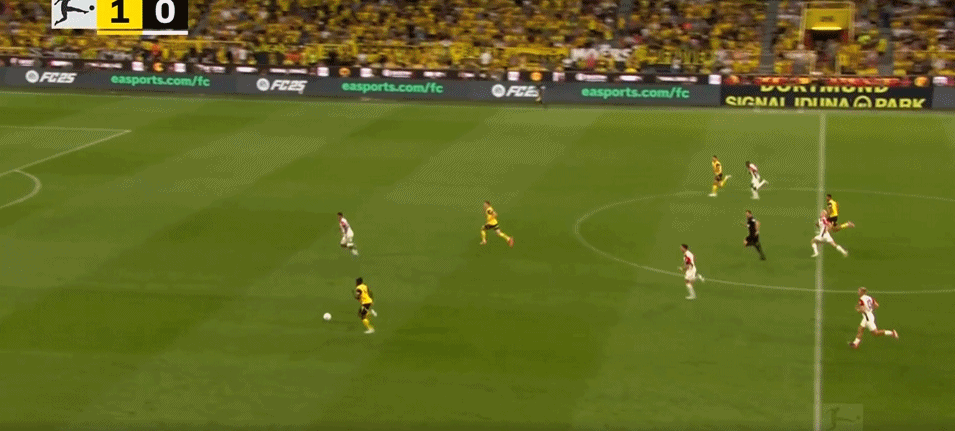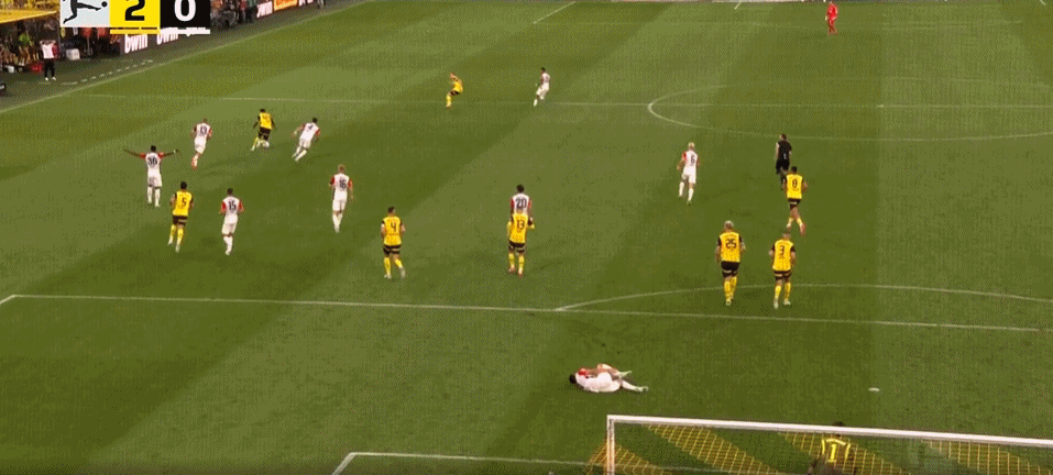 第90+3分钟,吉滕斯带球突入禁区,面对门将推射破门!多特2-0