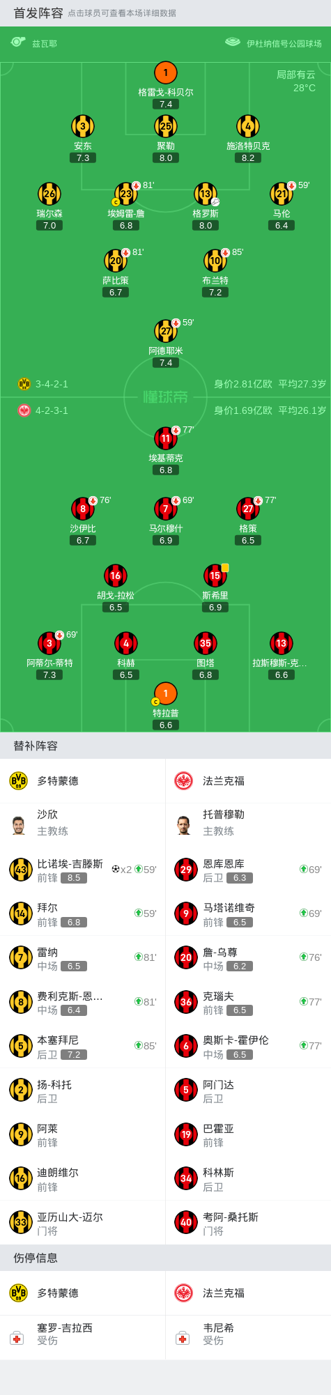 全场比赛结束,多特2-0击败法兰克福收获开门红。
