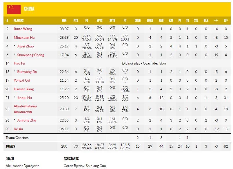 中国队数据:任骏飞8分5板、周琦8分8板2帽、沈梓捷6分、周鹏5分4犯、吴前4分2板7