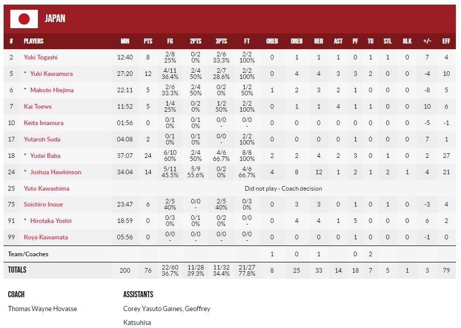 日本队数据:金丸晃辅12分、田中大贵5分2板4助、比江岛慎7分、幸树7分、罗西特5分2板3助3断