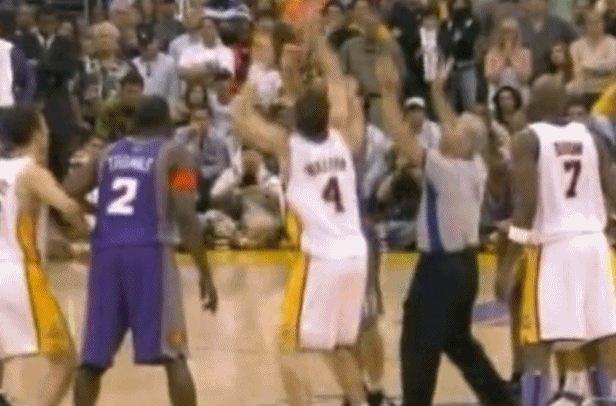 加时赛中两队比分犬牙交错,还剩6.1秒时湖人97-98落后1分,双方跳球。沃顿拼下球权,科比一路带球到三分线内突然急停跳投,球进灯亮,湖人完成绝杀!
