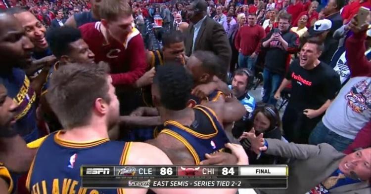 两队在比赛还剩下1.5秒时打成84平,骑士握有进攻球权。随后,德拉维多瓦底线发球,詹姆斯摆脱巴特勒防守接到皮球,然后踩着左侧三分线出手远投,球进灯亮。詹姆斯完成压哨绝杀,骑士客场以86-84险胜公牛。