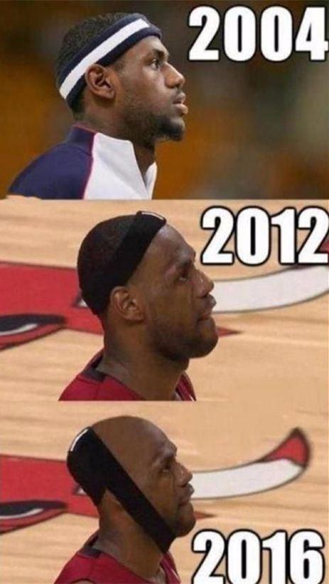 詹姆斯虽贵为天选之子,但是他的头发仿佛是上帝给他开了一个玩笑,在进入联盟后他的发际线便以肉眼可见的速度往后移,于是,无可奈何的詹姆斯便只能选择拿发带遮羞。不过,可笑的是,由于发际线上升速度太快,导致詹姆斯戴发带的高度也不断提高,网友甚至P了一张图来恶搞詹姆斯的发际线,也是相当有才了。
