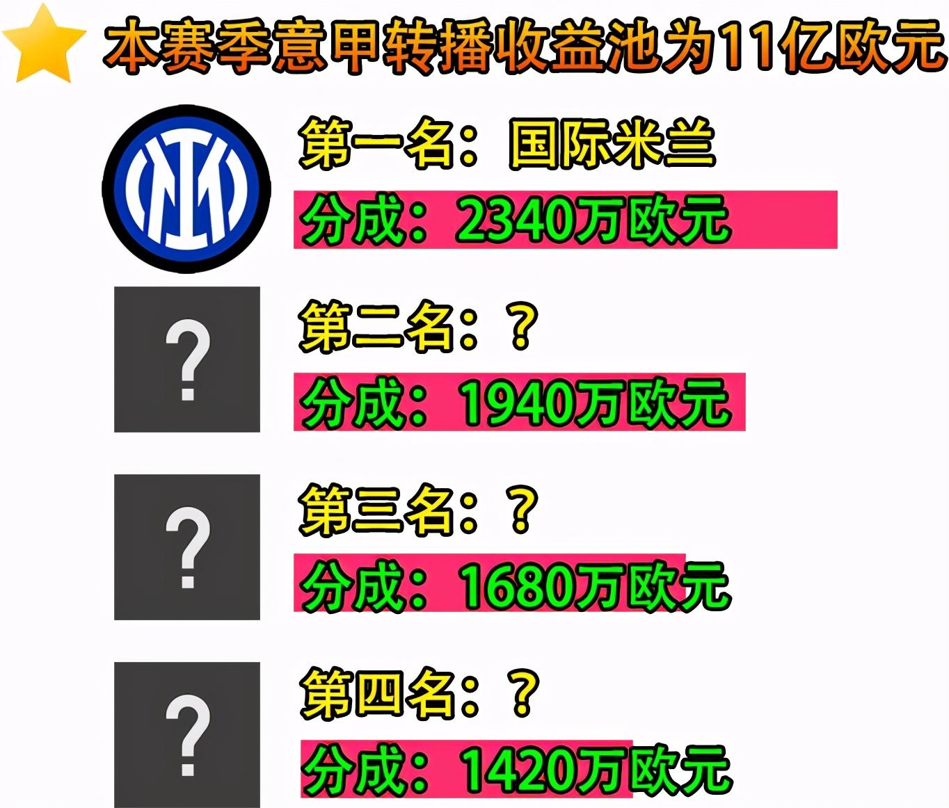 第二名跟第四名,转播分成少500万,欧冠分成也少500万,最少最少,都要损失1000万。