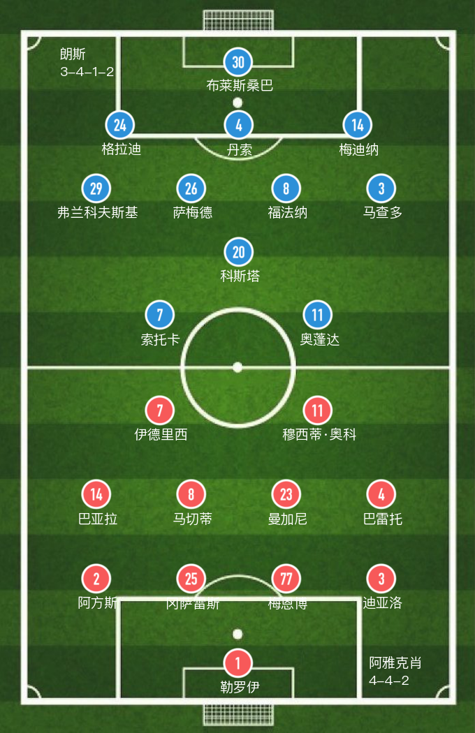 朗斯(3-4-1-2): 30-布莱斯桑巴,24-格拉迪,4-丹索,14-梅迪纳,29-弗兰科夫斯基(76' 19-卡博),26-萨梅德,8-福法纳,3-马查多(85' 21-海德拉),20-科斯塔(76' 22-萨伊德),7-索托卡,11-奥蓬达(76' 9-加纳戈)