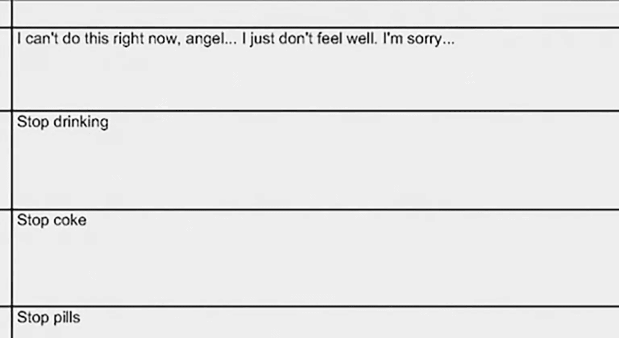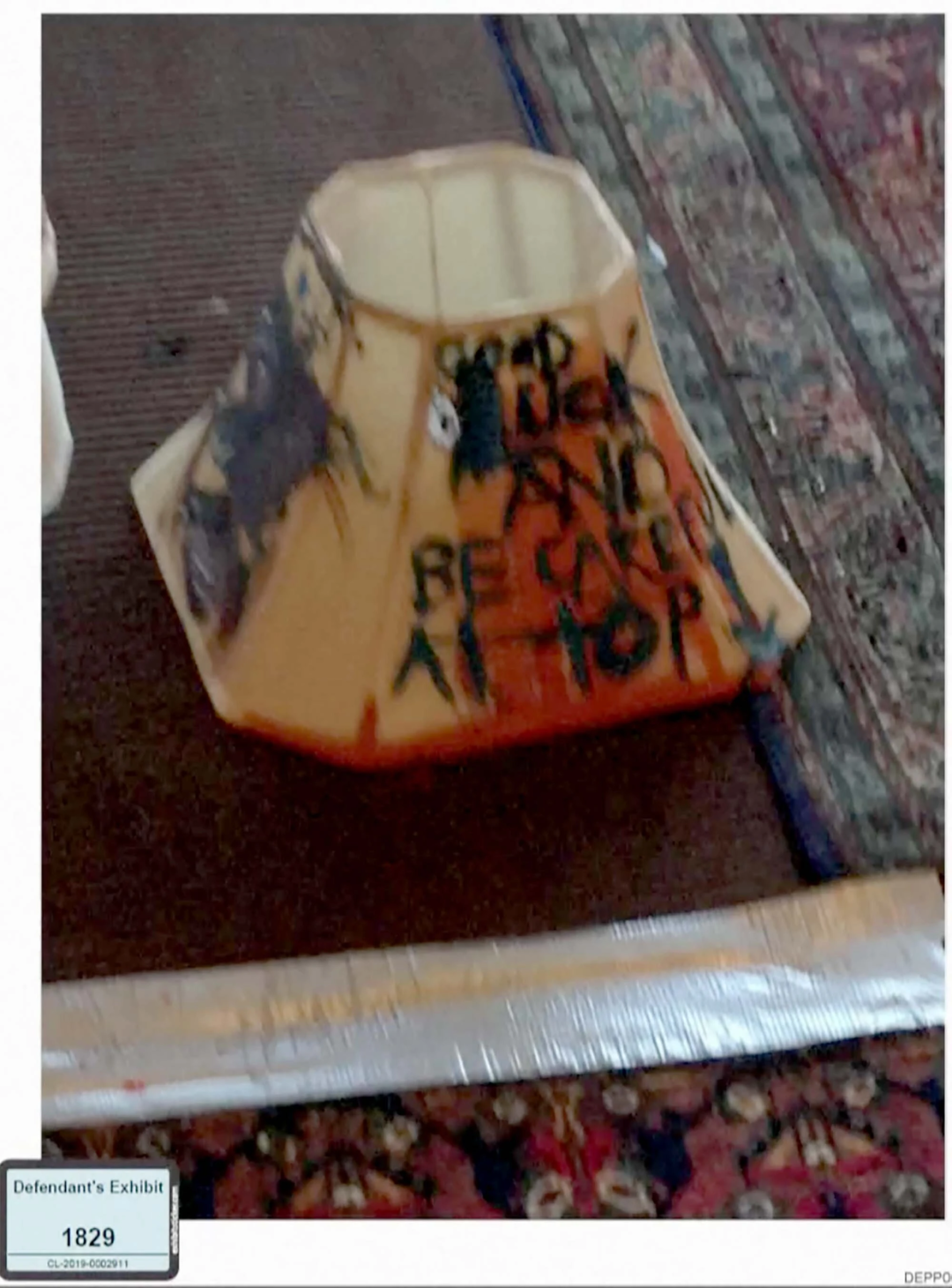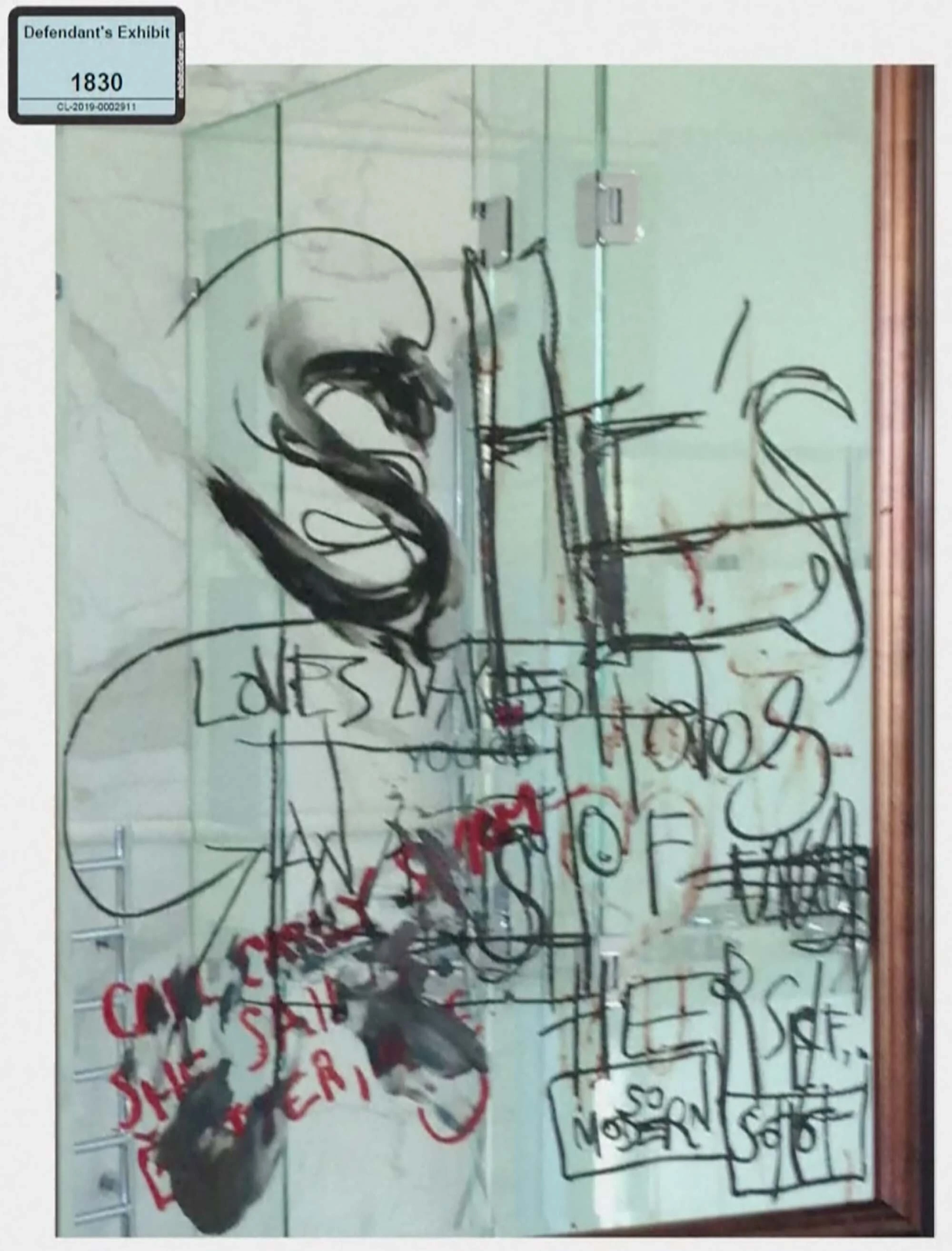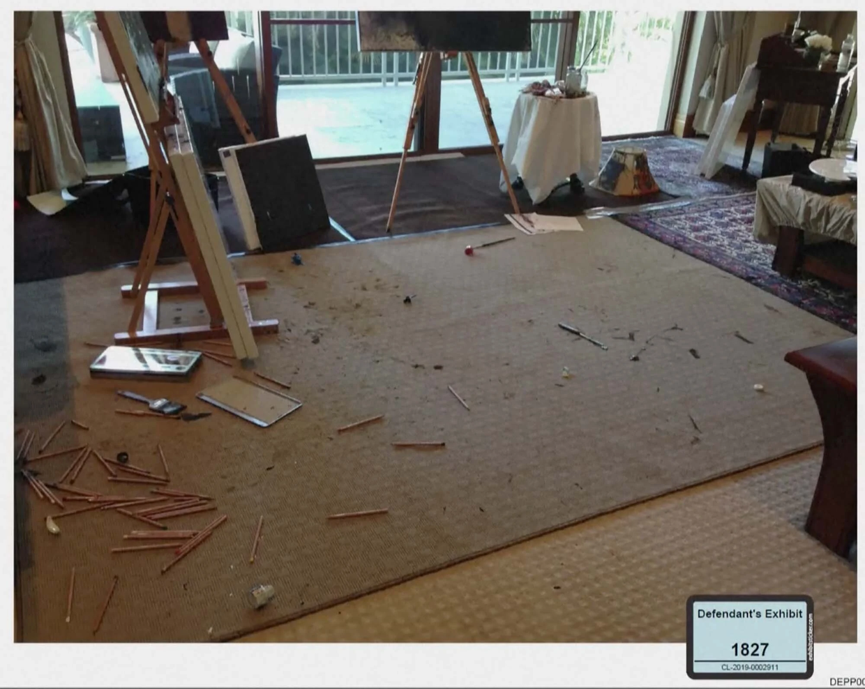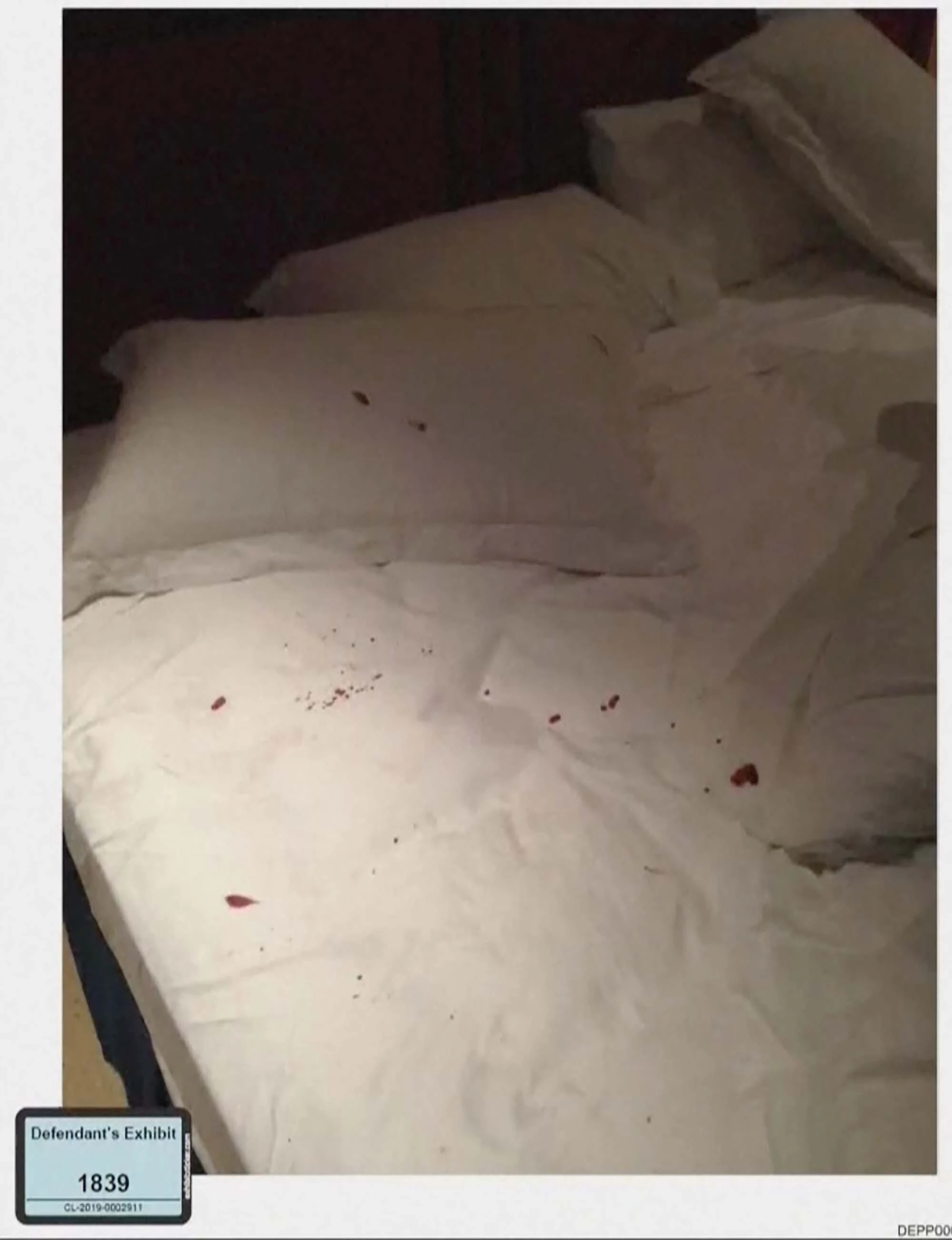 这次争斗后,德普用口红,笔和自己的血在房间里大肆涂鸦,安珀表示一个枕头上被他用血写了字,内容很难辨认。