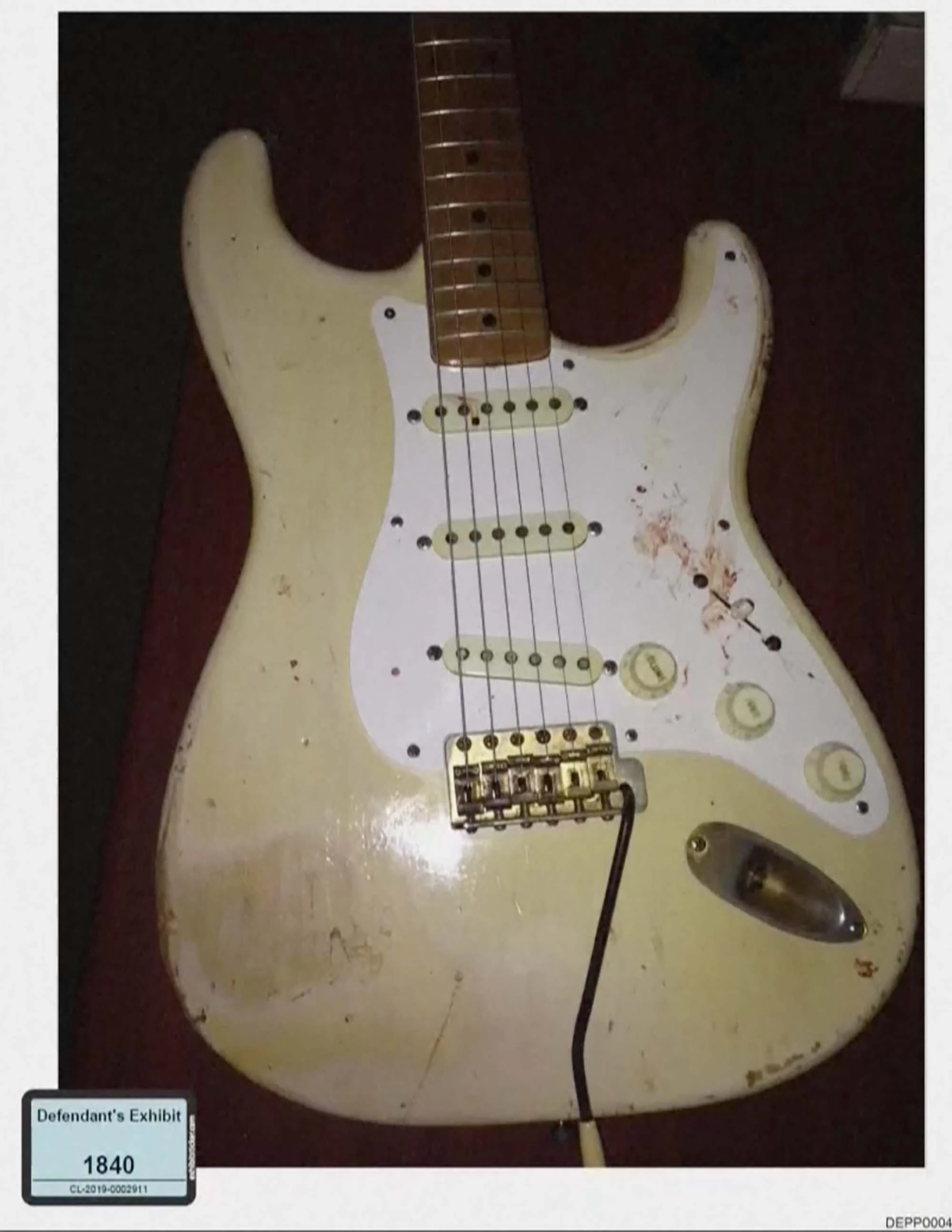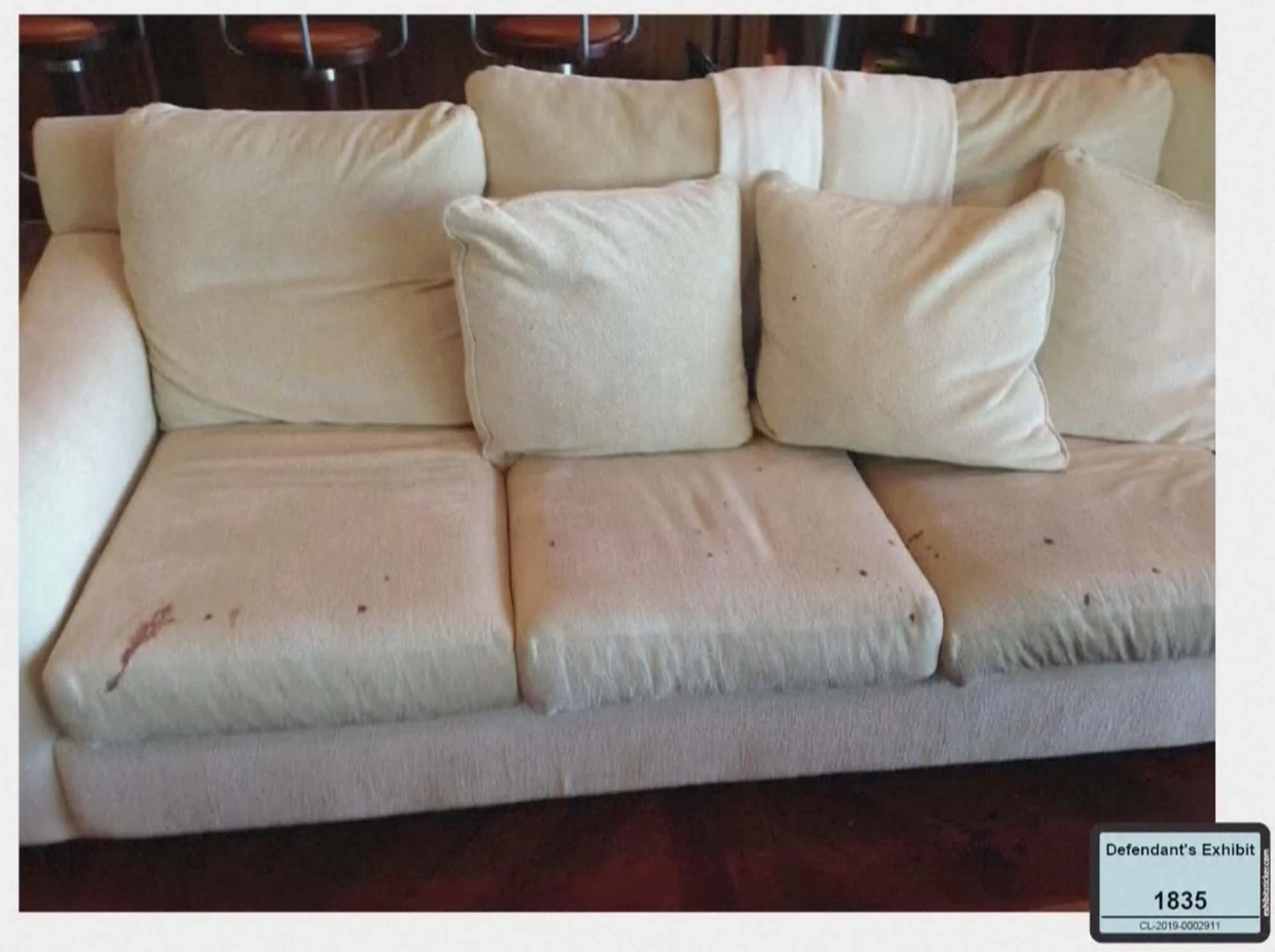 还有打斗后家里的沙发、床单、德普的吉他上到处是血迹,墙角被碎玻璃碴铺满的照片: