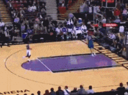 大风车还不过瘾,拉文再给你玩个罚球线起跳胯下换手!完成这次暴扣之后,整个多伦多都沸腾了!人类竟然也能做出这种动作!真是令人难以置信!