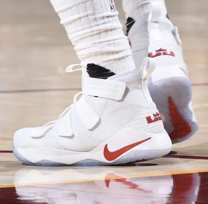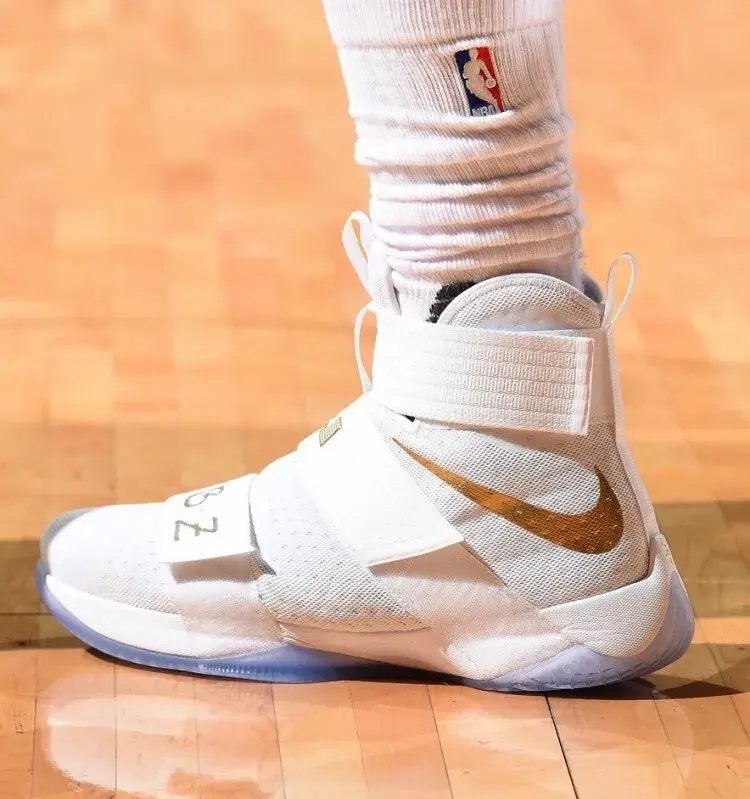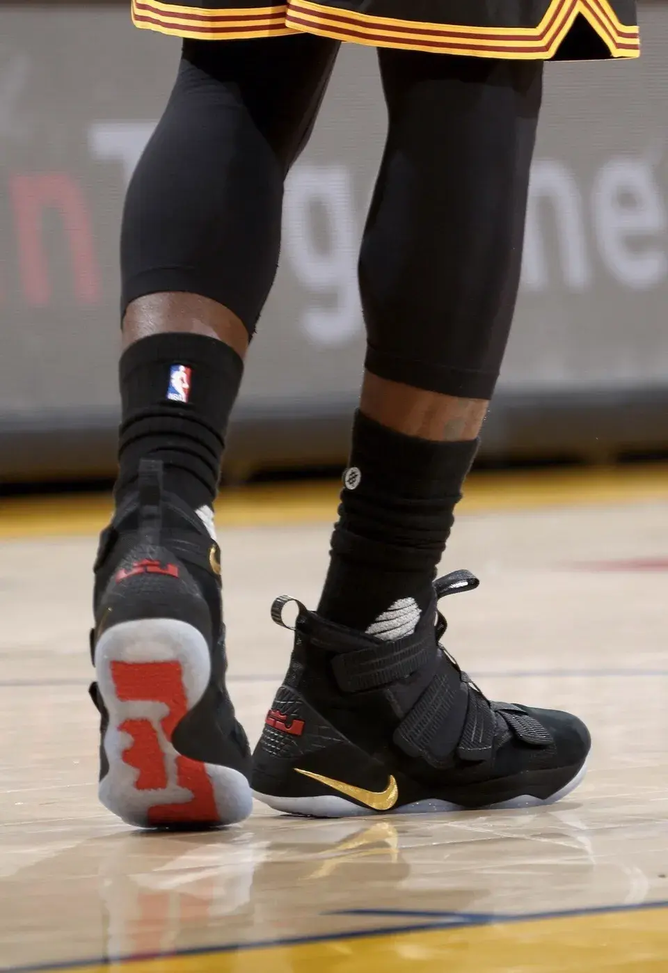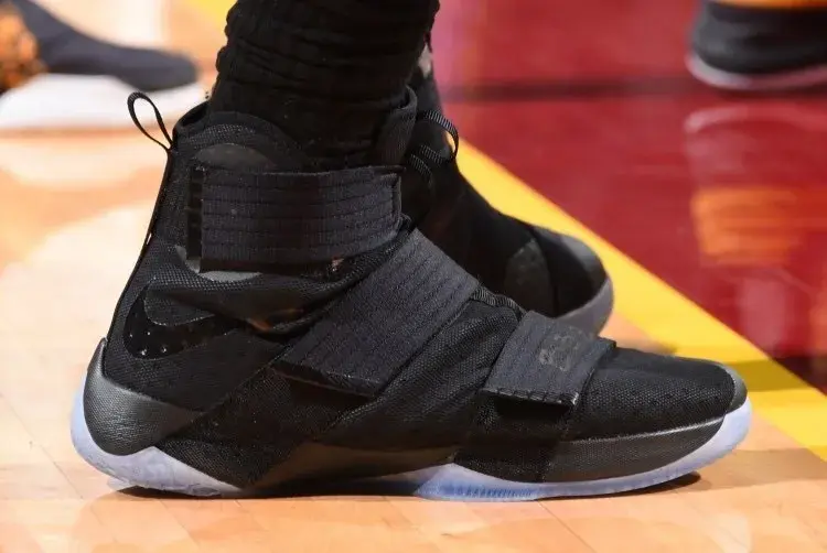 2016年,詹姆斯带领骑士在1比3落后的情况下,最终以4比3逆转73胜的勇士。詹姆斯在系列赛最后几场,放弃了之前一直穿的LeBron 13 Elite PE,改穿全新的Soldier 10,这款球鞋非常独特,没有鞋带,用的是三条绑带来固定。第七场客场,詹姆斯穿的是黑金配色,