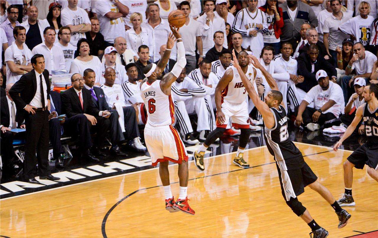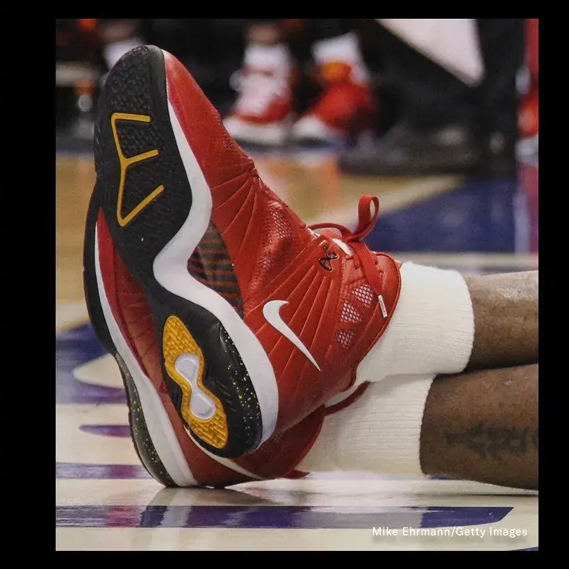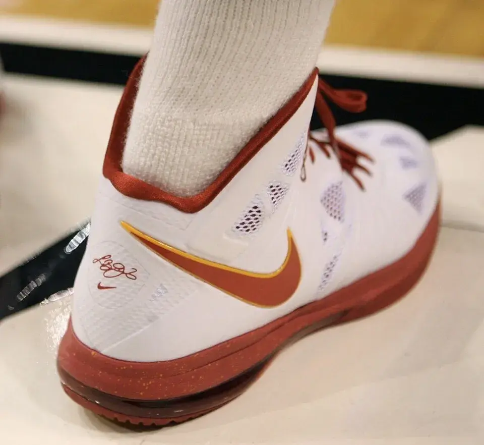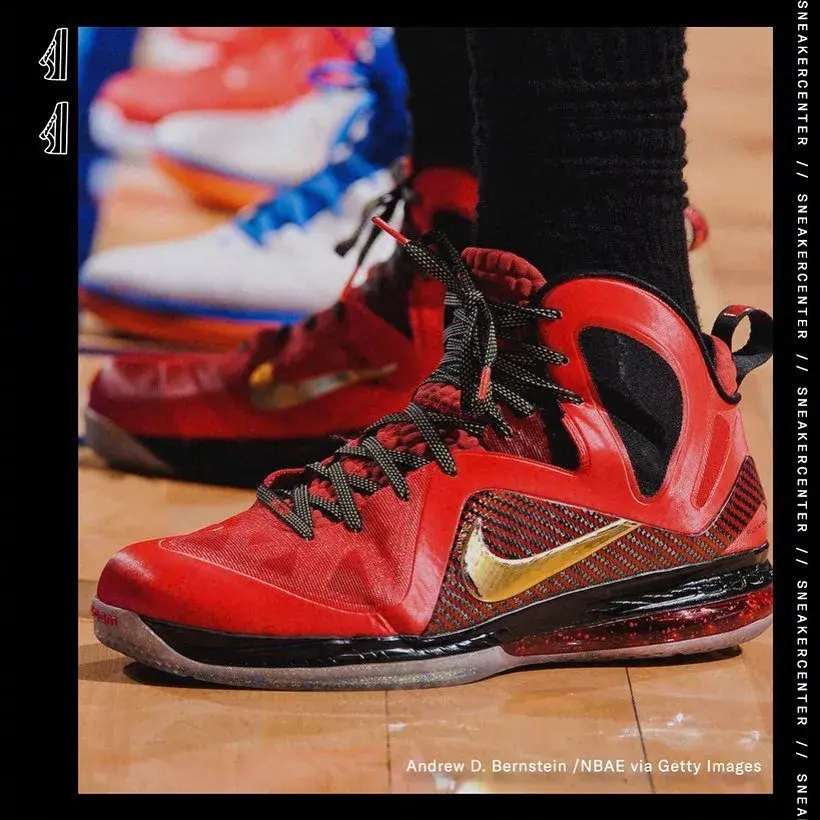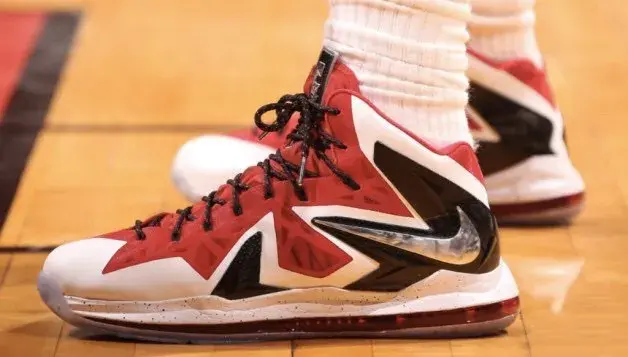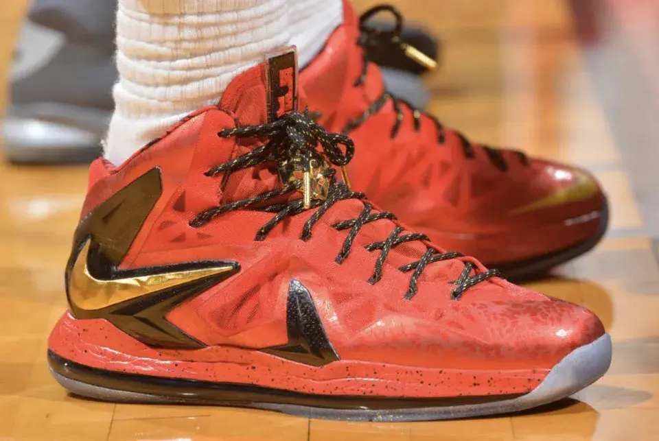 2013年,热火4比3险胜马刺,艰难卫冕。詹姆斯在最后两场穿了一双红色的LeBron 10 Elite PE。詹姆斯正代系列中,10差不多是球迷眼中最好的一款,穿着舒适,外观也不错。而大红配色非常骚气,也和热火的logo颜色很搭配。詹姆斯正是穿着这双大红鞋,在最后两场带队连赢2场,成功翻盘。