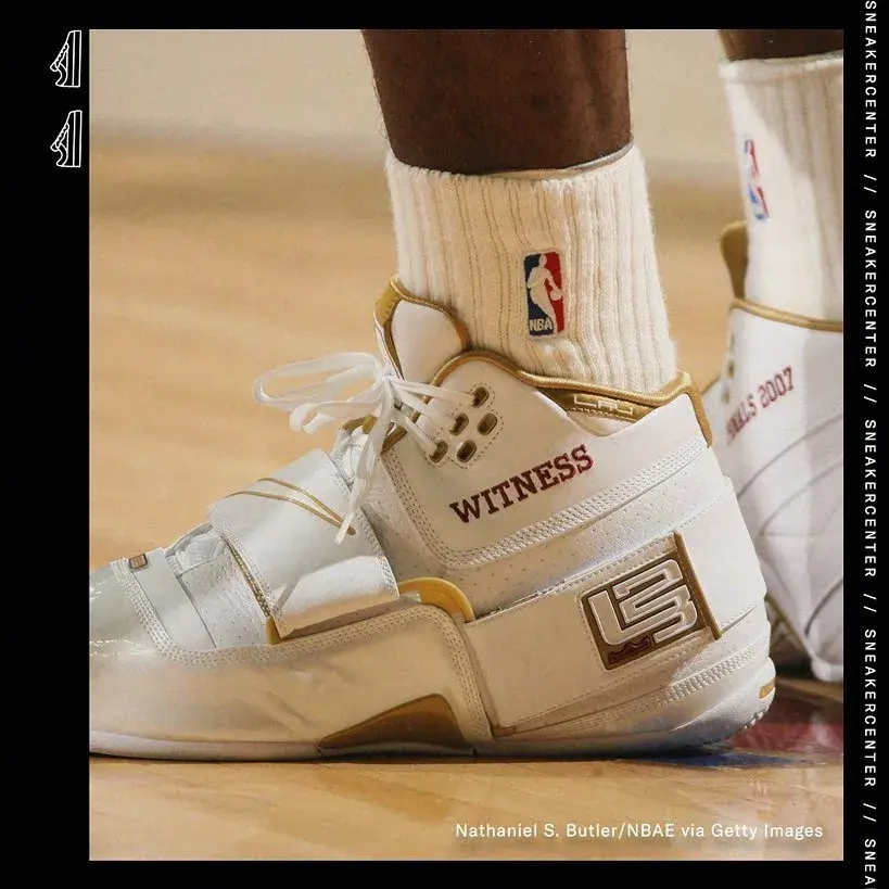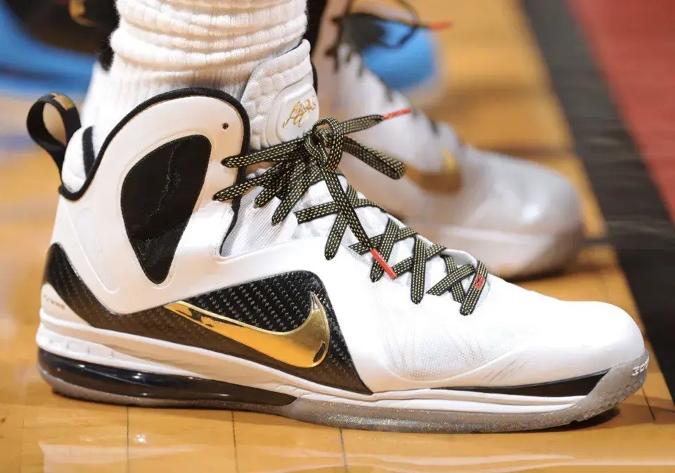 2012年是詹姆斯第一次夺冠,他在和雷霆的总决赛中带领热火以4比1取胜。登顶的第五场,詹姆斯穿的是一双白色的LeBron 9 Elite PE。这双鞋外观很大气,尤其是耐克的勾子是金色的,有种帝王之相。