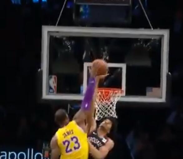 湖人客场对阵篮网,勒布朗-詹姆斯突破扣篮惨遭贾瑞特-阿伦大帽。这是詹姆斯职业生涯第1850次扣篮中第9次遭到封盖。