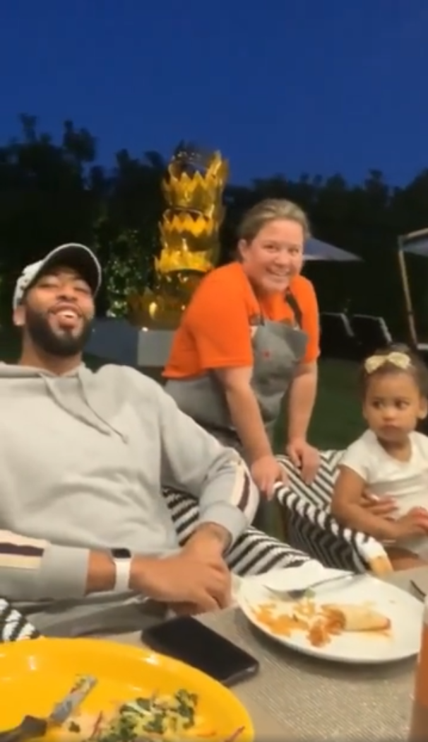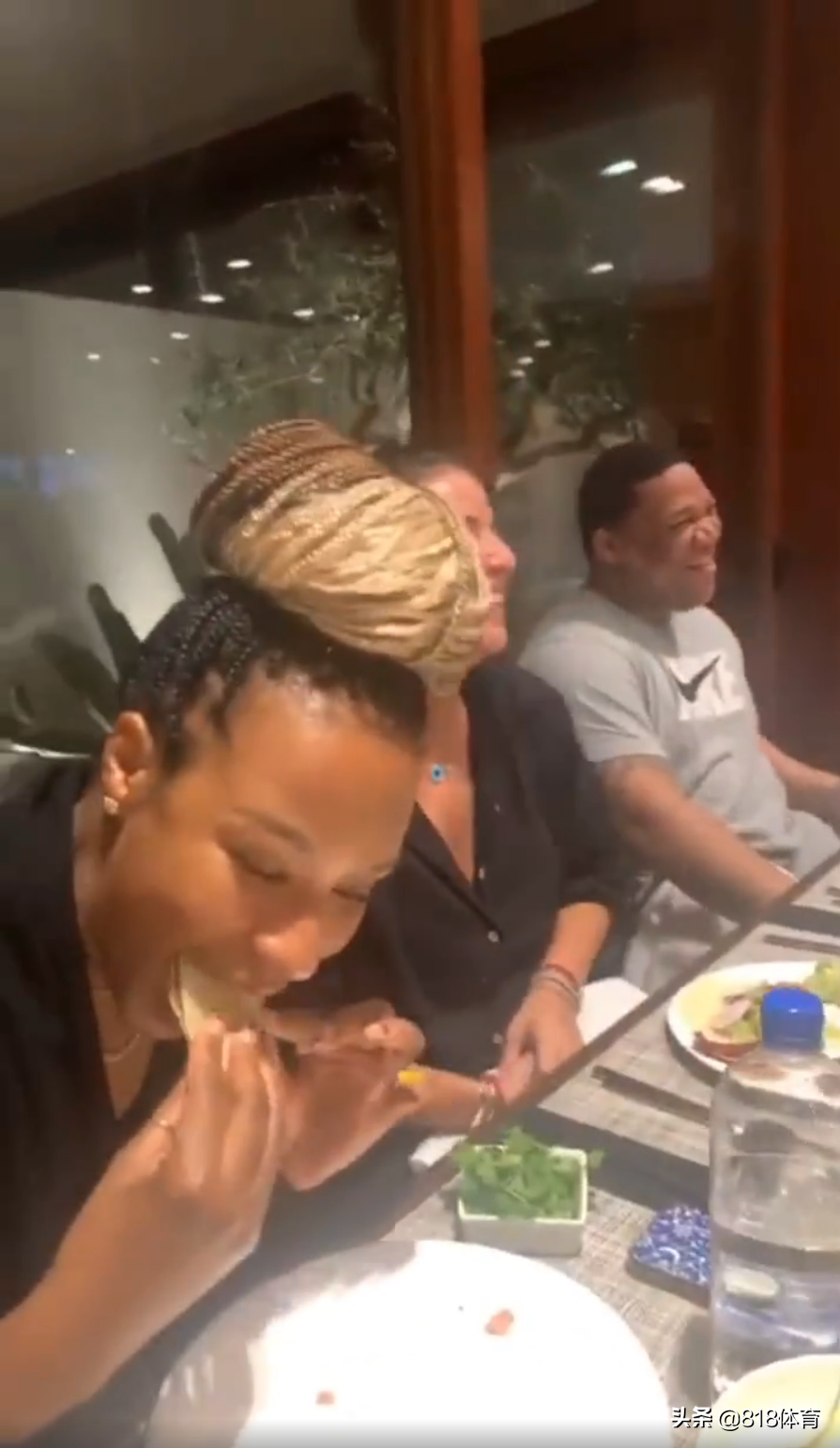 接下来,詹姆斯介绍了新客人,队友浓眉一家人也在餐桌上就座,浓眉就坐在詹皇左手,还有他的妻子和女儿。